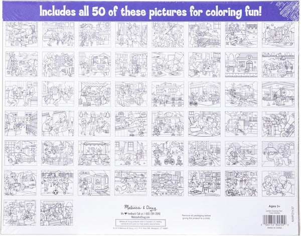 - 11" x 14" jumbo coloring pad with 50 outline pictures of occupations and scenes from around the community to color in