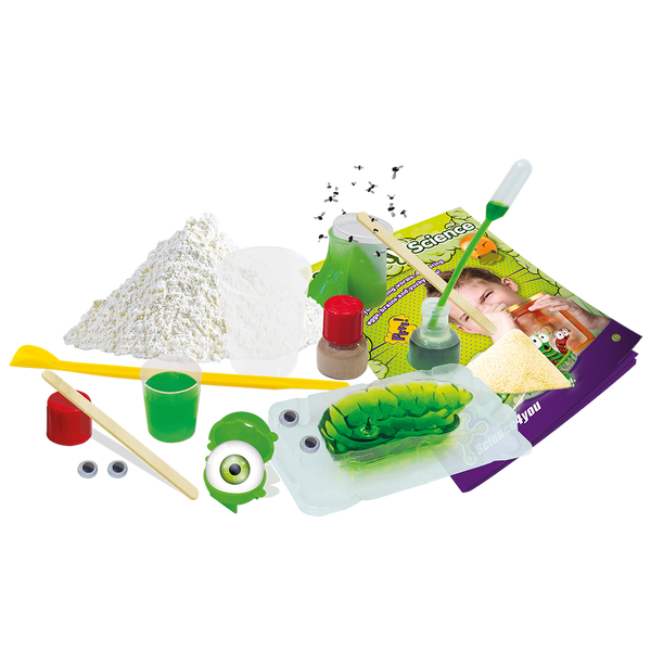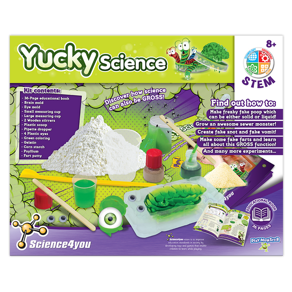 With the YuckyScience Kit, kids discover how science can be gross–in a fun way! Kids like yucky stuff like poop, farts, worms and brains–so why not learn about them while playing?! Includes 12 experiments: Grow an awesome sewer monster, create fake snot and fake vomit, make some farts and learn about this gross function! Adult supervision recommended. Ages 8+