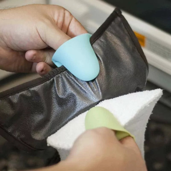 Diaper Dawgs Finger Guards are flexible, slip-on silicone barriers that guard parents’ fingers against pee & poo during a typical cloth diaper cleaning routine: separating soakers and inserts from covers/pockets, holding a dirty cloth diaper while spraying, or general sorting through a dirty wet bag.