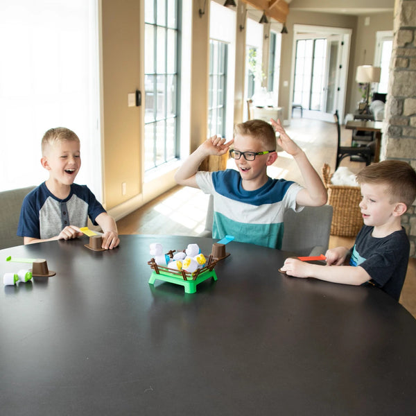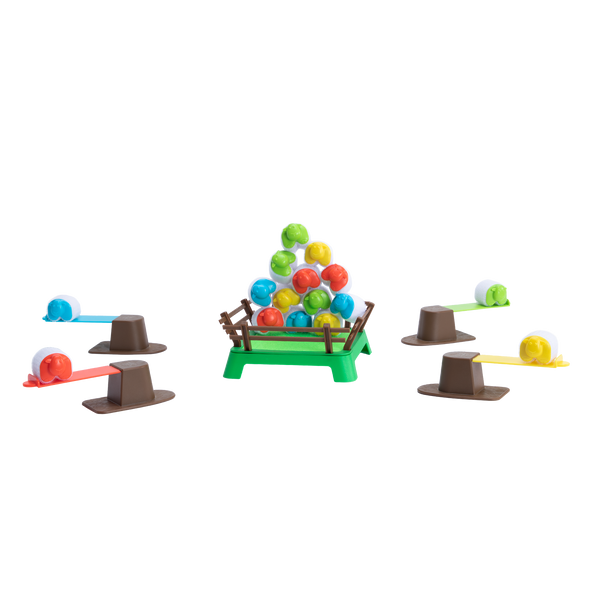 Taking turns, players use their springboard to launch their sheep onto the hook-and-loop paddock. Each sheep is covered with hook and loop fabric. Plan your approach, aim right, then - Land them, stick them, and pile 'em up! The first to get all of their sheep to stay in the field wins the game! Forget sheep-herding and discover the thrill of sheep-launching with the fast and fun game of Heap-O-Sheep.