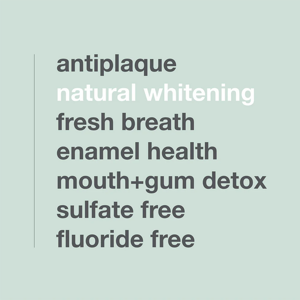 calcium carbonate (limestone abrasive), purified water, sodium bicarbonate (baking soda), vegetable glycerin, hydrated silica, xylitol (birch derived), sodium cocoyl glutamate (coconut derived), carrageenan (seaweed derived), mentha piperita (peppermint oil), mentha viridis (spearmint) leaf oil, pimpinella anisum (anise) seed extract, gaultheria procumbens (wintergreen) leaf oil, stevia (leaf extract).