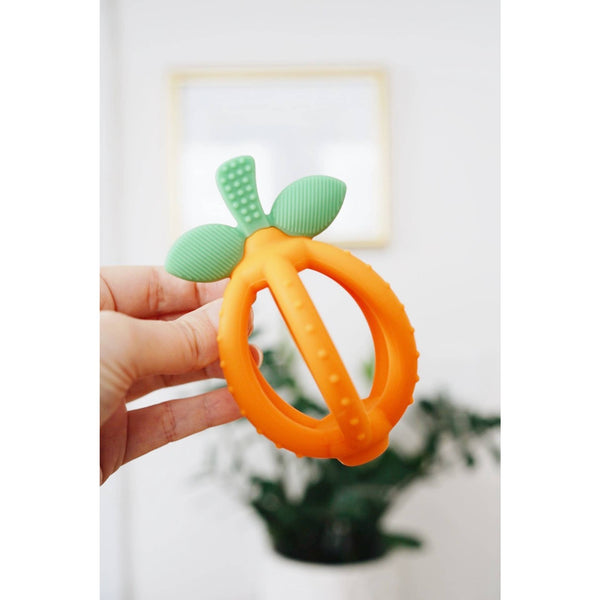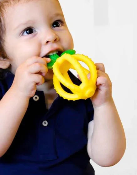 Sore gums are no match for the Itzy Ritzy Bitzy Biter™ Teething Ball! This multi-texture teether is perfect for providing comfort as it soothes your child's emerging teeth and calms sore, swollen gums. It also acts as a training toothbrush on the stem. The teething ball is shaped like a lemon and is made of non-toxic food grade silicone. The open design makes it perfect for small hands to hold.