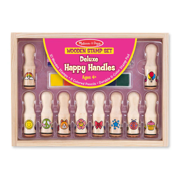 With cheerful artwork and easy-to-grasp handles, this set of 10 rubber stamps is perfect for preschoolers! The extra-long wooden handle keeps fingers off the ink pad as kids stamp rainbows, balloons, peace signs, stars, a smiling sun, and much more. Housed in a sturdy wooden storage tray, the set also includes a six-color ink pad, plus five pencils to color in each stamped shape. Ink is machine washable. With 10 unique designs, this deluxe set is the perfect complement to our Happy Handle Stamp Set - or a terrific gift set on its own!