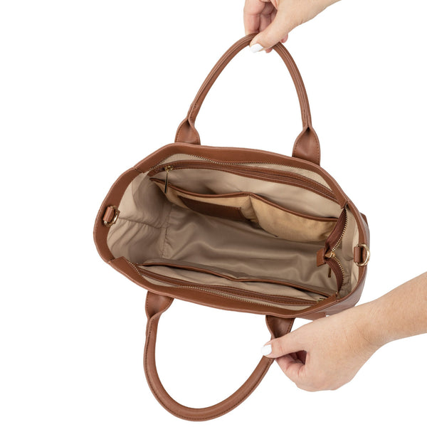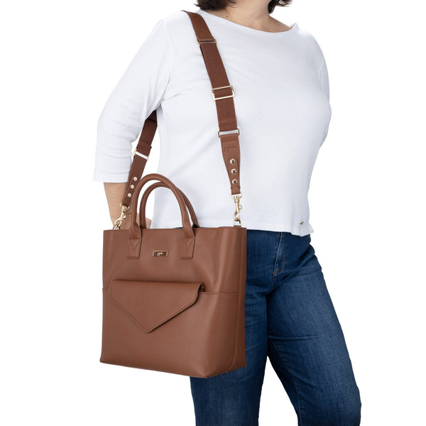 With buttery soft vegan leather and clean lines, the 24-7 Tote elevates your look all day, every day. Durable construction with detailed stitching accents, a zippered opening, roomy interior, and the perfect number of pockets ensure that this chic tote from our Beyond Collection will be your new favorite bag. The removable After Hours Clutch quickly escapes the front pouch when you need just a few essentials. This quilted clutch features a magnetic envelope opening that innovatively secures the clutch back into the main bag with ease. Included with each 24-7 Tote is a memory foam changing pad and an empty hand sanitizer bottle along with a matching storage case … it’s removable so you can attach it to any of your other bags. Multiple carrying options include the perfect length tote handles to carry at your elbow as well as a removable and adjustable messenger strap for a carefree crossbody look. To capture an effortless essence, search no further than our 24-7 Tote.