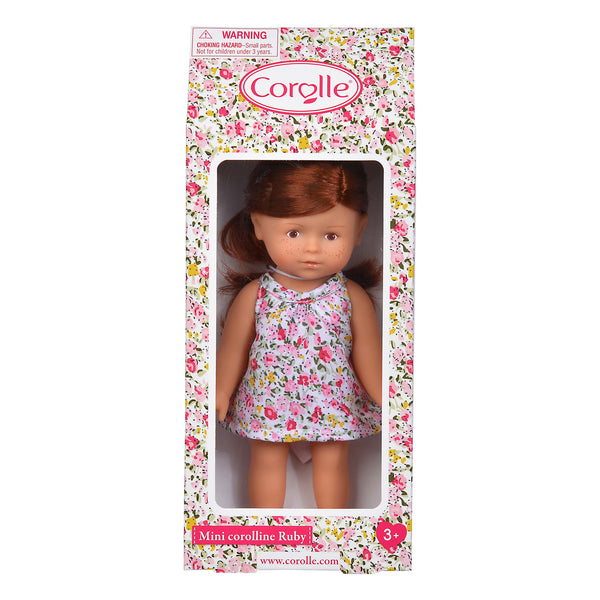 Mini Corolline Ruby is a petite 8-inch doll ready to offer for any gift-giving occasion, with an all-vinyl body that is soft to the touch and delicately scented with vanilla. Ruby has brown painted eyes and long, comb-able red hair. She's dressed in a charming floral-print "three hole" wraparound dress over underpants and matching molded shoes (not removable). At just 8 inches tall, Ruby is the ideal size to slip into a bag or backpack and accompany your child all day long.