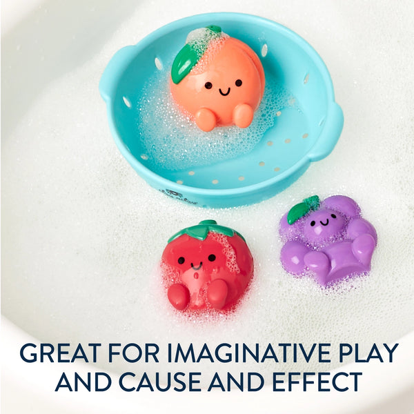 Squeeze in some fun! With Itzy Splash Pals™ bathtime play is overflowing with possibilities! These squeezable fruit-shaped squirties and sprinkle strainer encourage motor skill development and are great for creating endless bath time adventures!