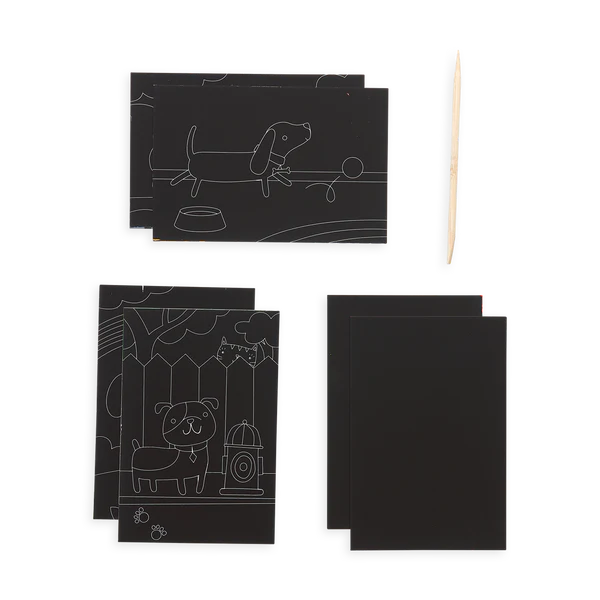 Get busy scratching because these cute dogs are waiting! These pup themed scratch art cards are filled with easy-to-follow guidelines to reveal the canine inspired rainbow artwork. Sized for on-the-go fun at 4 x 6 inches these mini scratch art kits for kids are great for travel. Each kit not only has 4 cute dog illustrated cards but 2 blank cards for creating your own designs, all revealing a rainbow of color using the included wooden stylus.