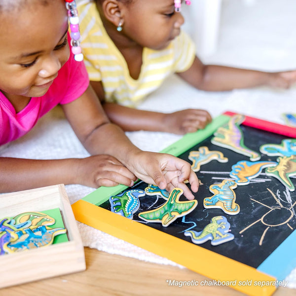 Twenty magnetic dinosaurs eager to play in the twenty-first century! Bright colors add excitement to this dino collection contained in a convenient wooden case.