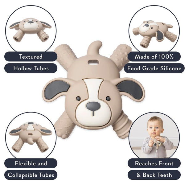 Soothe and massage baby’s sore gums with the Ritzy Teether™! The textured hollow tubes collapse and flex reaching both front teeth and back molars. This silicone teether is sure to entertain while providing comfort and relief for your little one.